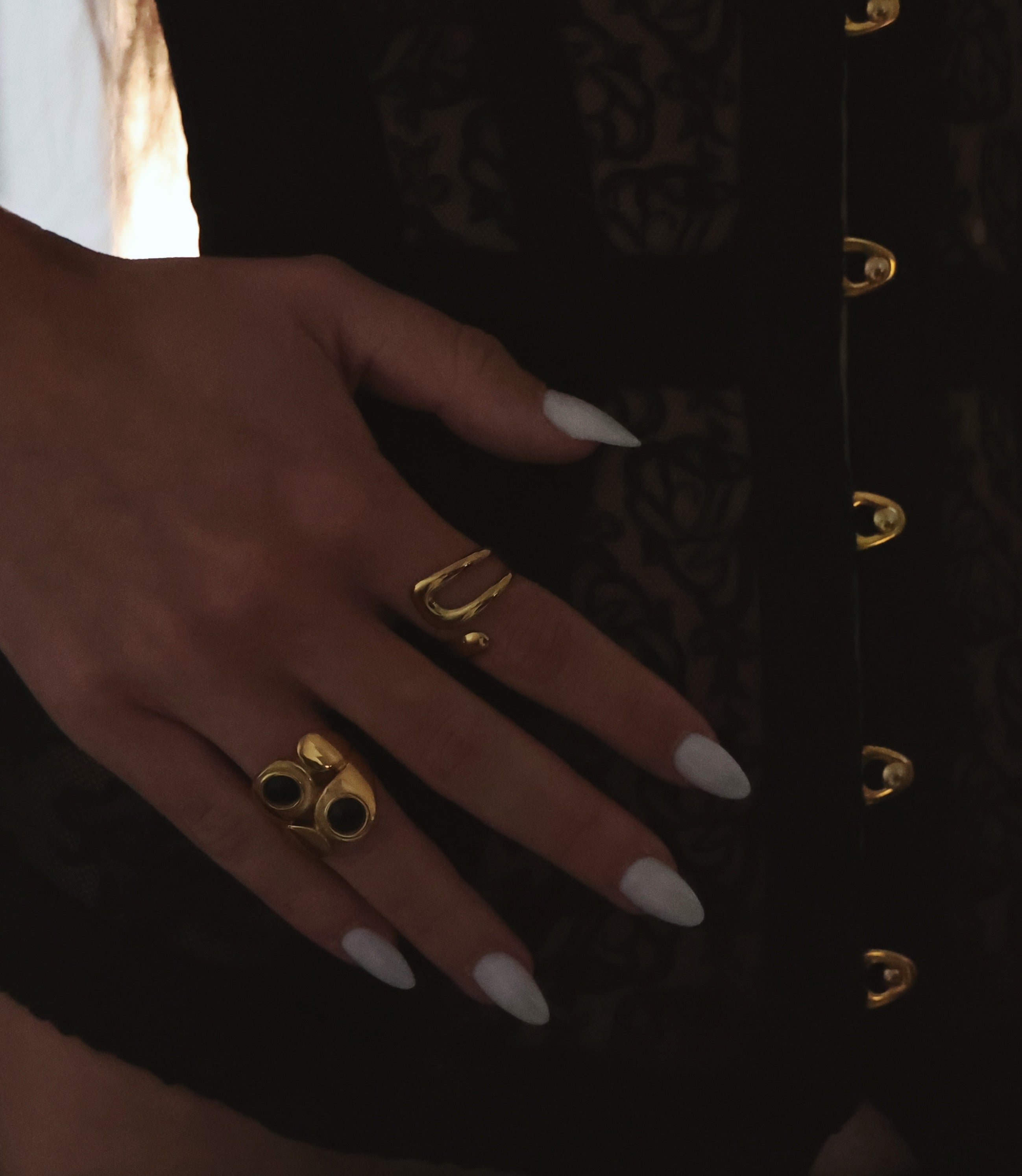 Two black stones, one message: no regrets. Don't say sorry wraps strength in gold, made for the ones who own their power without explanation.